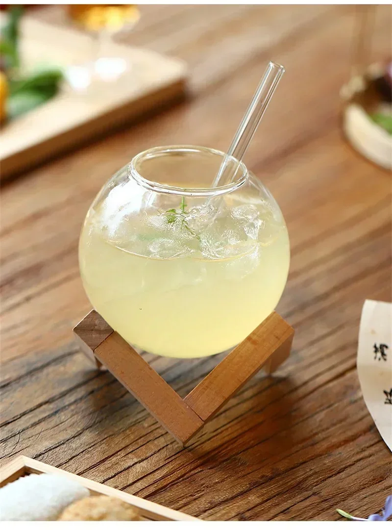 Tazza da cocktail in vetro con sedile inferiore in legno e cannuccia Bicchieri sferici creativi Tazza da bere Frullato Bicchiere da succo Bar Cucina